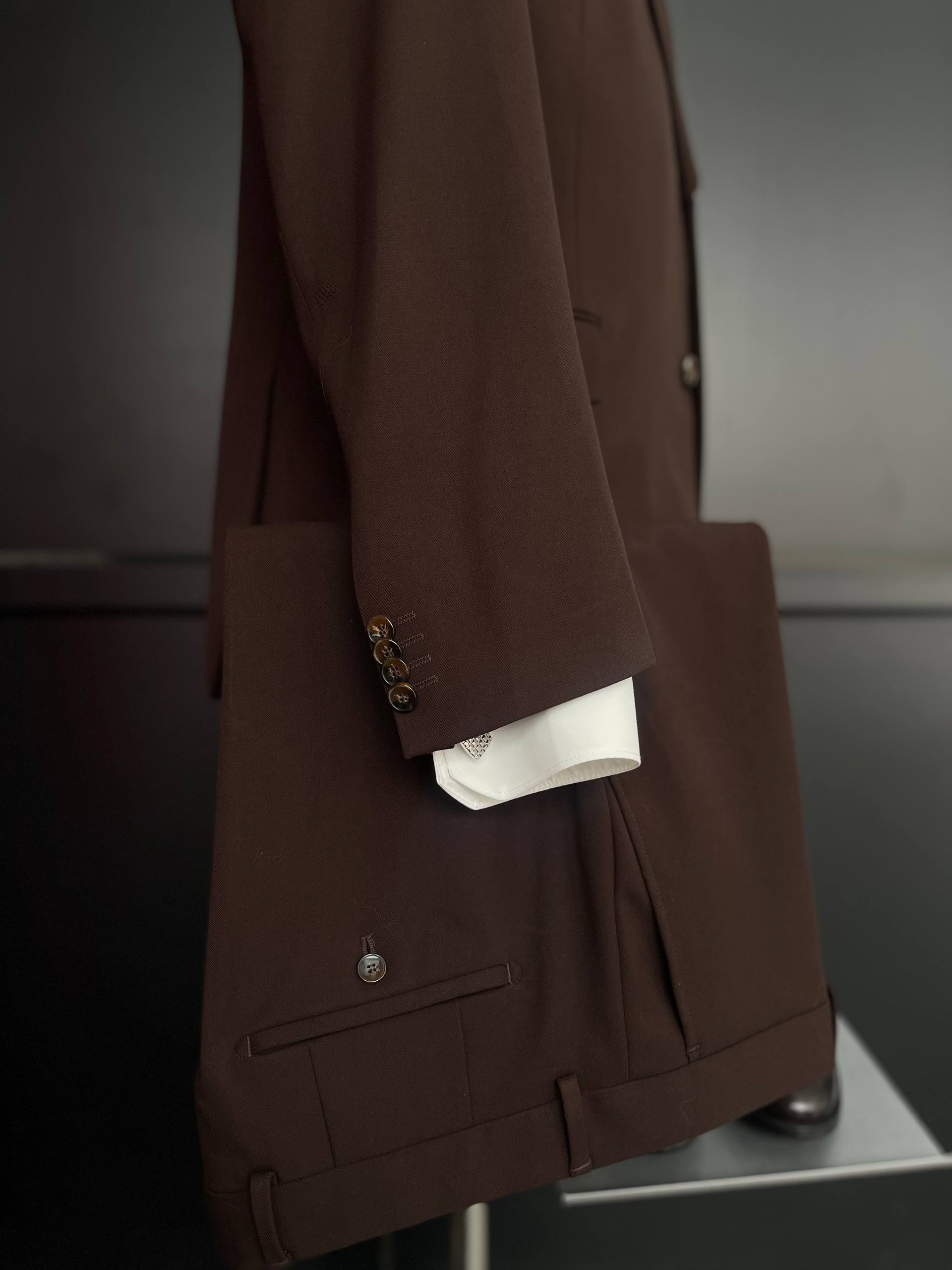 Костюм-двойка в благородном шоколадном оттенке — идеальный выбор для деловых встреч и торжественных мероприятий. элегантный и стильный, он подчеркнет вашу индивидуальность и профессионализм.