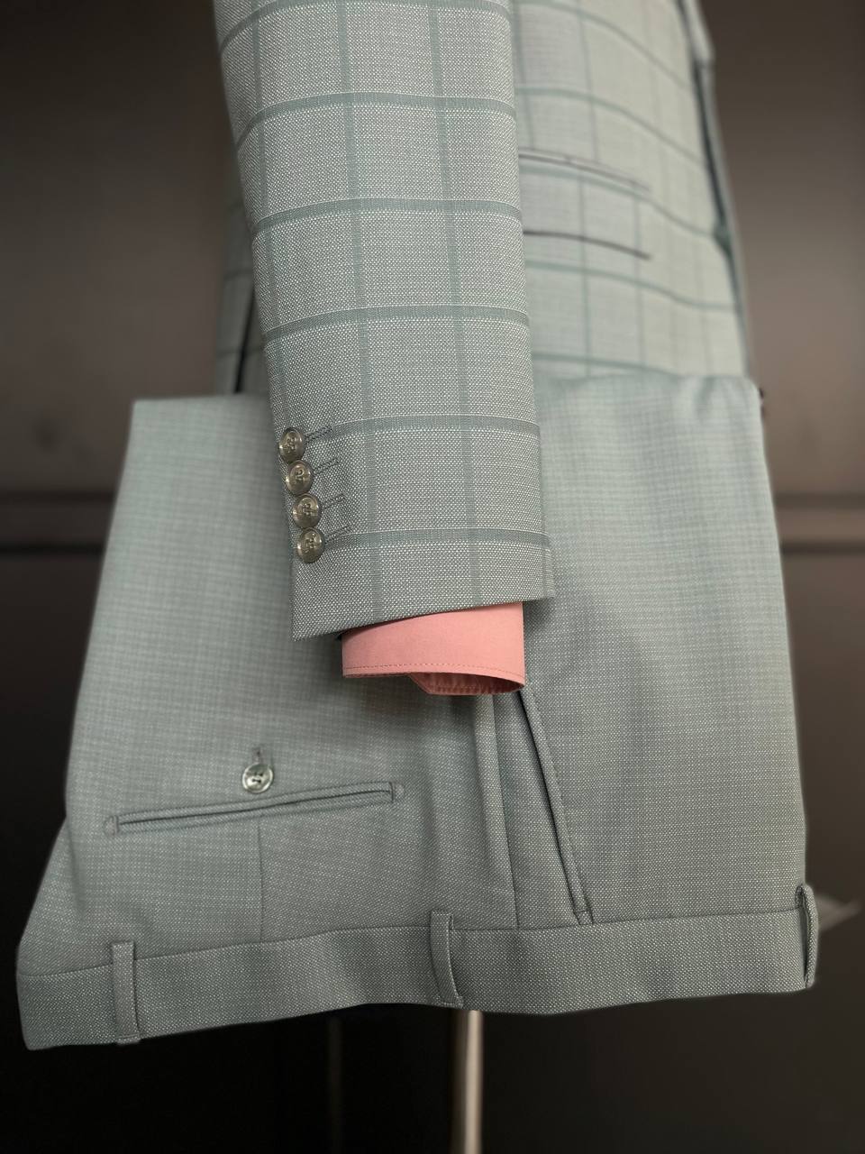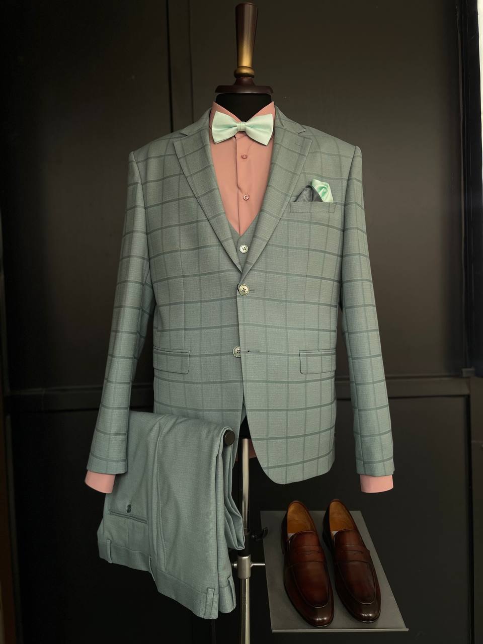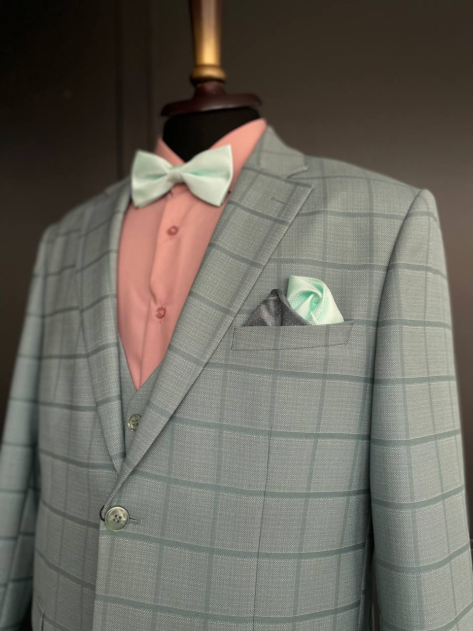 Бирюзовый костюм-тройка с акцентным пиджаком в крупную клетку представляет собой стильное и яркое решение для любого гардероба. Такой костюм отлично подойдет для деловых встреч, торжественных мероприятий и романтических свиданий, подчеркивая вашу уникальность и чувство стиля.