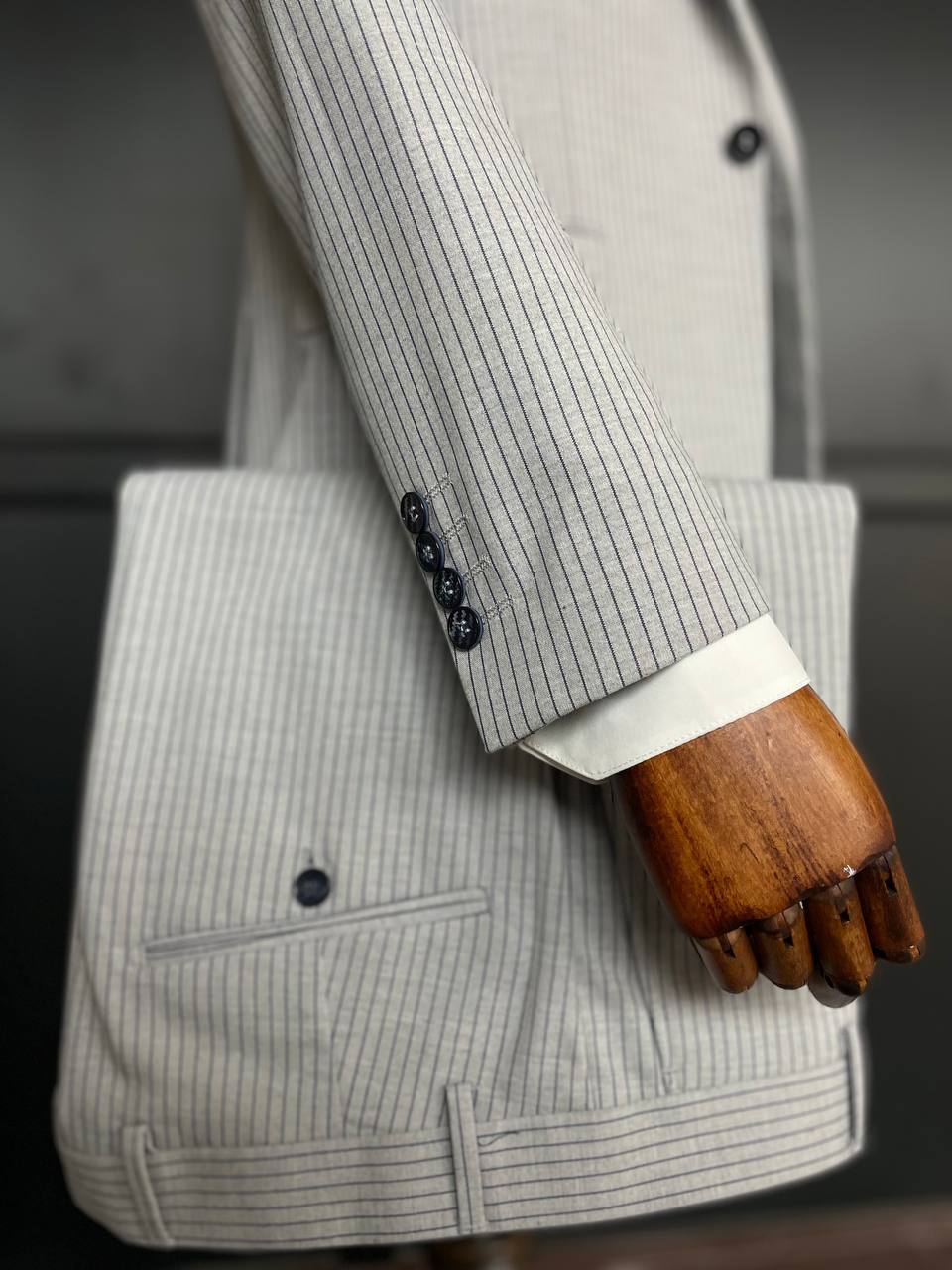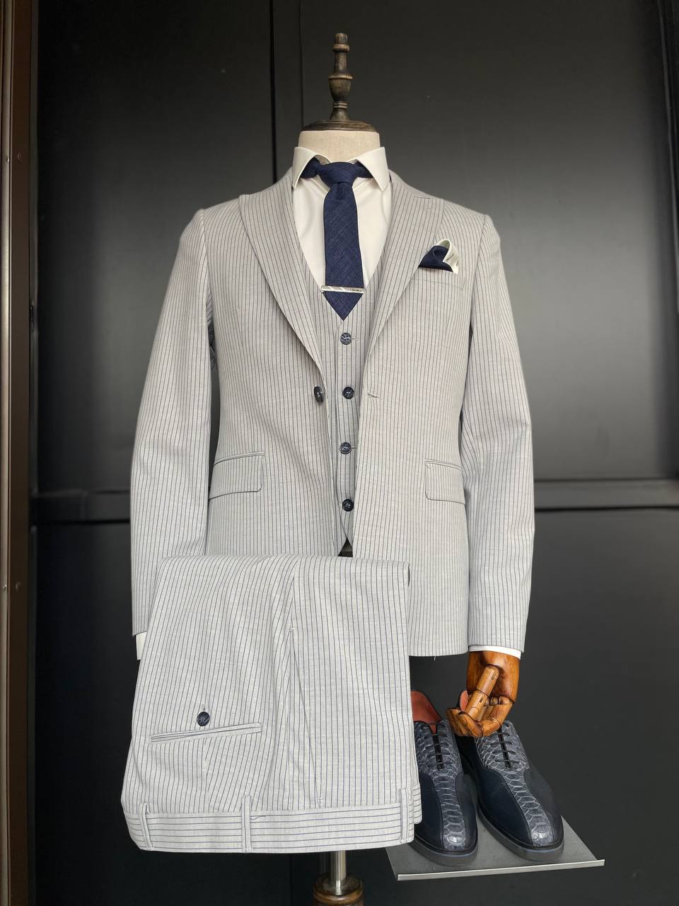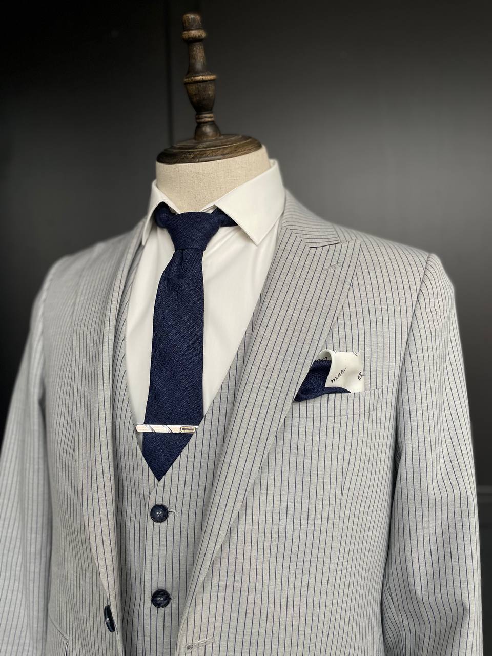 Серый костюм-тройка в синюю полоску — стильный и сдержанный! Такой костюм выглядит элегантно, а благодаря классическому дизайну отлично подойдет для официальных мероприятий или повседневных образов. Его классический силуэт и слегка заметная полоска добавляют образу строгости и уникальности.