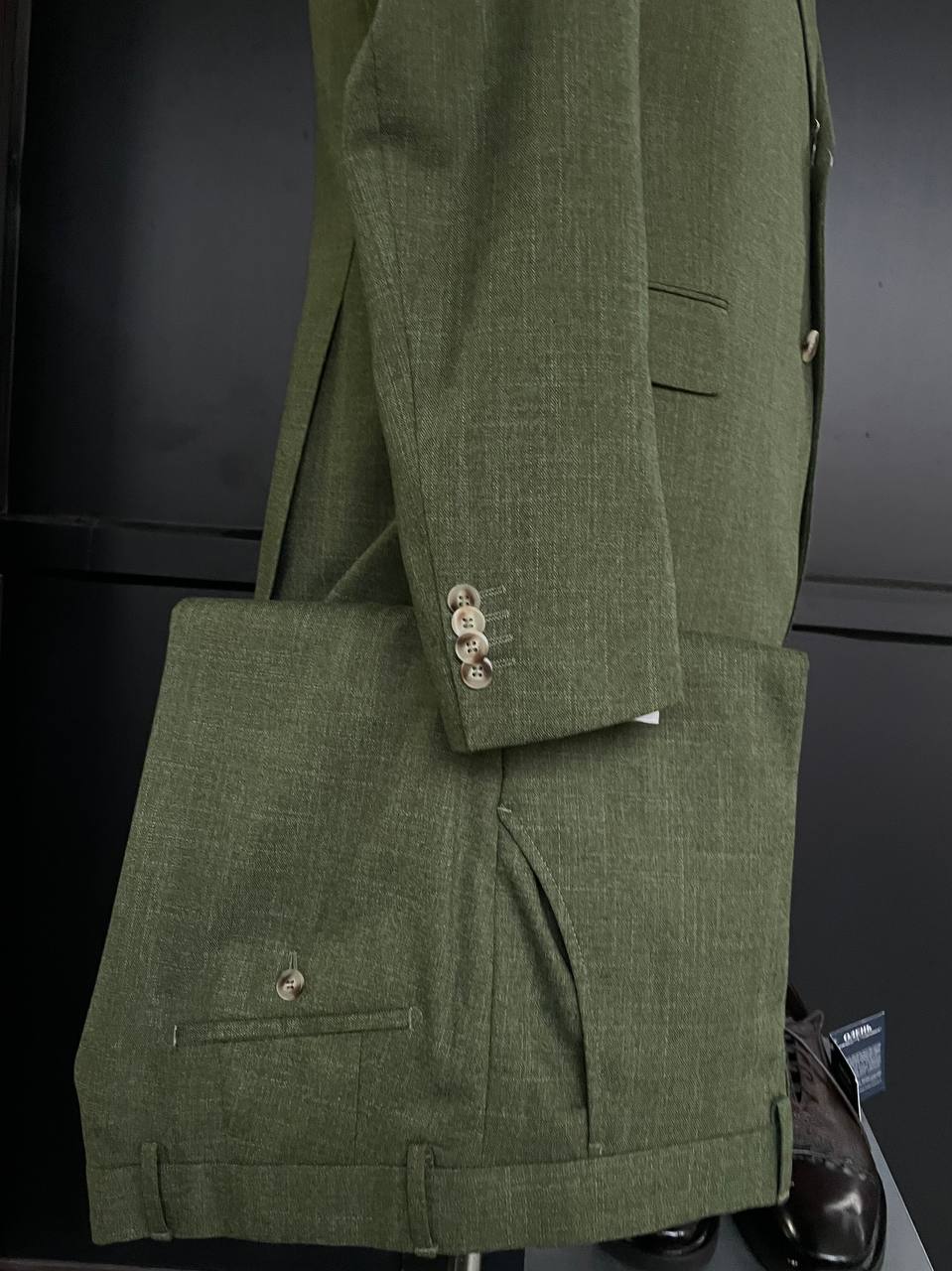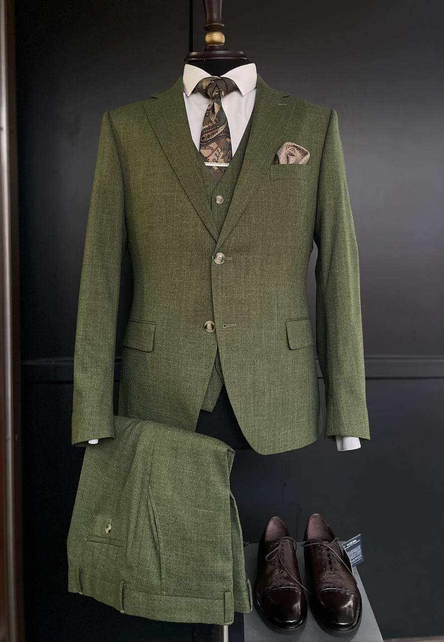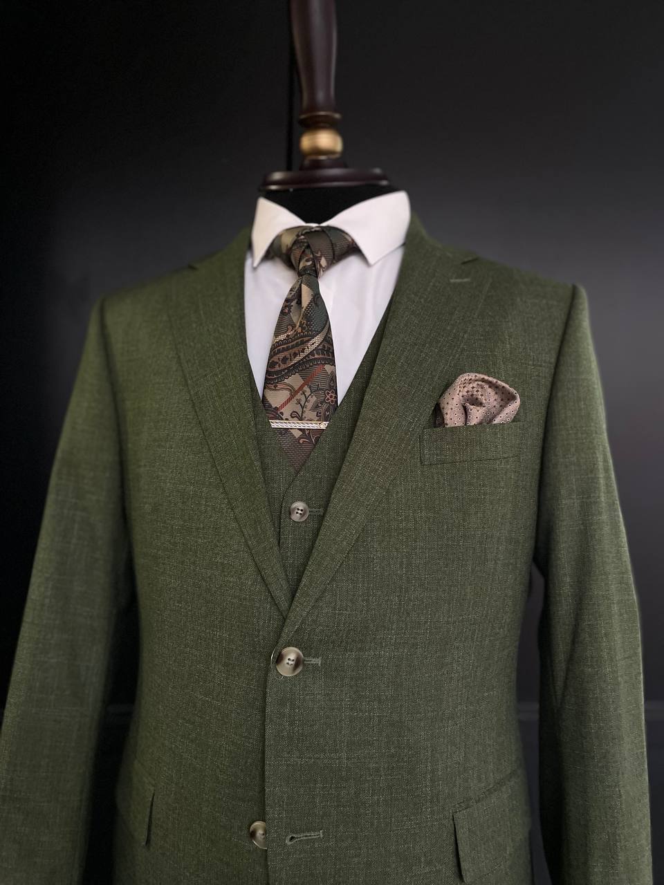 Костюм-тройка в зеленом оттенке с акцентным галстуком в узор — это элегантное и современное решение для делового или торжественного мероприятия. Насыщенный цвет придает образу изысканность, а аккуратно подобранный галстук с узором добавляет яркости и индивидуальности.